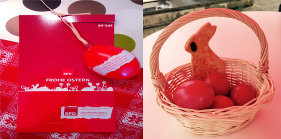 Das beherrschende Sinnbild unseres Osterfestes ist heute das Osterei. Seit langem gilt das Ei als Symbol neuen Lebens. Schon die alten Ägypter, Perser, Griechen und Römer färbten zu ihren Frühlingsfesten Eier. Die Germanen brachten der Göttin Ostara Eier als Opfergaben dar. Die kirchliche Eierweihe ist bereits ein dem 4. Jahrhundert bekannt. In der Gegend von Worms wurden in Steinsärgen aus dem Jahre 320 v. Chr. Bemalte Gänseeier als Grabbeigaben gefunden. Übrigens, nach den Überlieferungen dürfen die Eier nur am Ostersamstag gefärbt werden. Die Farbe Rot steht für Kraft, Liebe, Lebensfreude, Wärme und natürlich für die SPD.