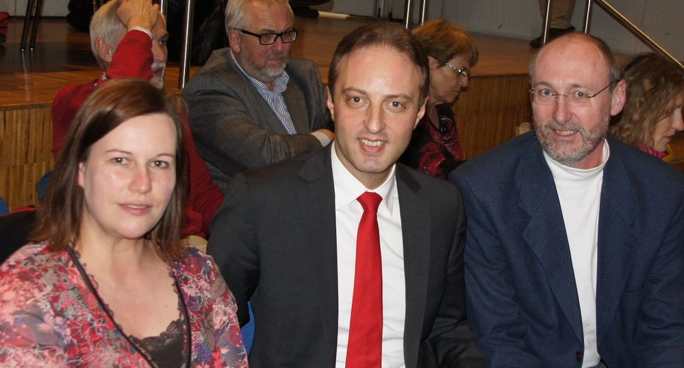 Bundestagskandidat Macit Karaahmetoğlu (Mitte) mit Iris Pohl-Mattern und Lutz Enzensperger bei der Wahlkampfkonferenz